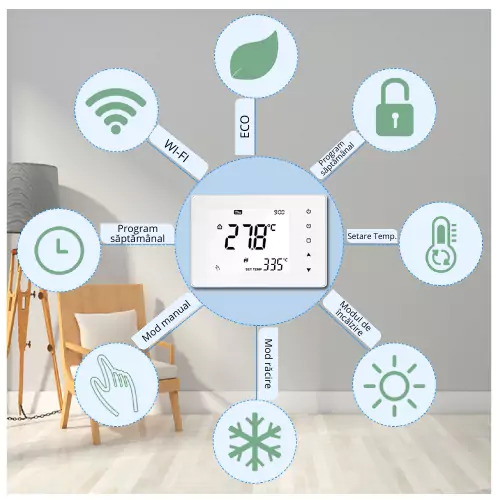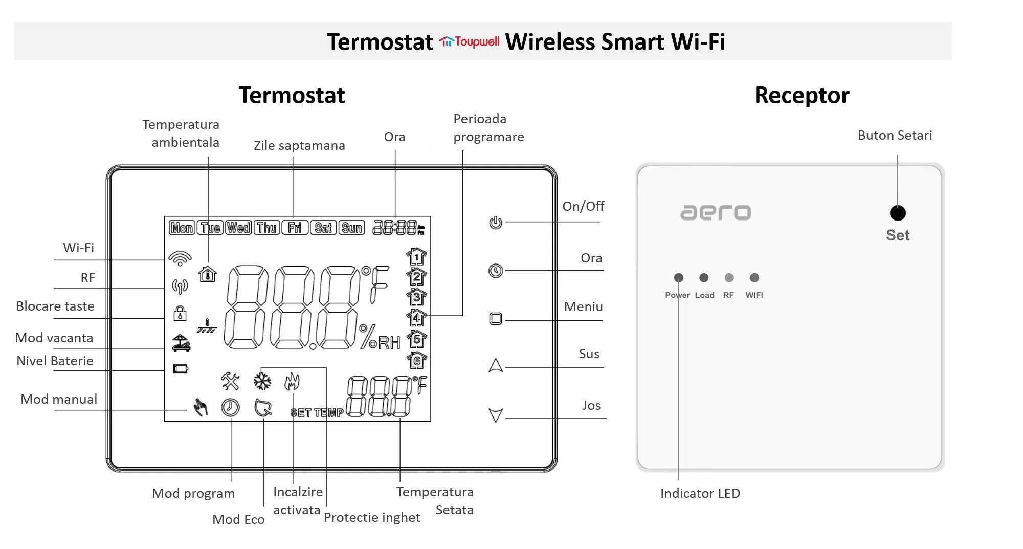 Spre deosebire de termostatele convenționale cu un singur bloc, acest aparat este un nou tip de termostat în care funcția termostatului este împărțită în două blocuri. Receptor și centru de control. Distanta mai mare de 150 m.