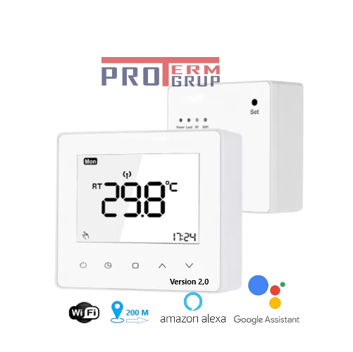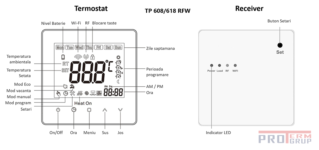 TP618RFW/608RFW — это новый беспроводной программируемый термостат с поддержкой Wi-Fi. TP618RFW/608RFW может заменить наиболее распространенный бытовой термостат и предназначен для использования с газовыми, электрическими, твердотопливными (древесина, пеллеты) или дизельными системами отопления. В отличие от обычного проводного термостата, состоящего из одного блока, этот новый тип термостата выполняет две функции: TR618RE/608RE Receiver и TP618SE/608RE Control Thermostat. Ресивер предназначен для подключения кабелями к системе отопления, таким образом контролируя включение/выключение тепла. Управляющий термостат работает без проводов и, таким образом, становится интерфейсом пользователя. Основная роль термостата заключается в обнаружении и контроле температуры, но его также можно использовать для изменения режима работы или изменения графика работы. Пользователь может разместить термостат на видном месте, чтобы иметь возможность считывать и контролировать температуру жилого помещения, в то время как приемник размещается рядом с системой отопления.