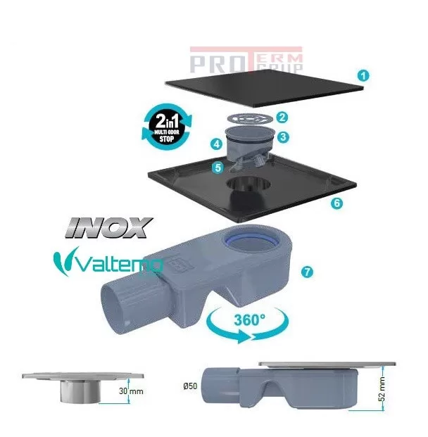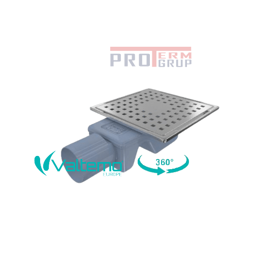 Специальное дизайнерское решение: стальная рамка и решетка; Пластиковый поворотный сифон (360°);Решетка и корпус — нержавеющая сталь.